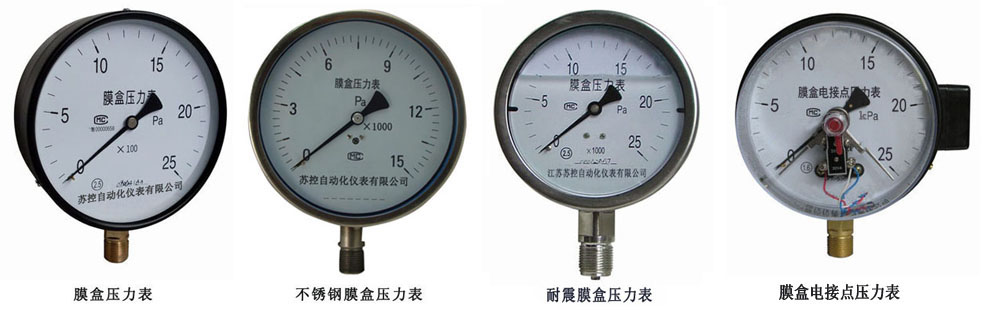 膜盒压力表由测量系统(包括接头,波纹膜盒等),传动机构(包括拔杆机构,齿轮传动机构),指示部件(包括指针与度盘)和外壳(包括表壳、衬圈和表玻璃)所组成。