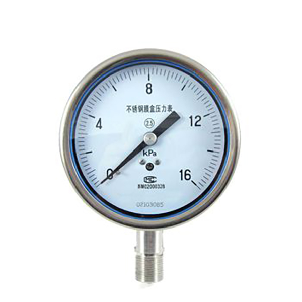 不锈钢膜盒压力表由测量系统(包括接头,波纹膜盒等),传动机构(包括拔杆机构,齿轮传动机构),指示部件(包括指针与度盘)和外壳(包括表壳、衬圈和表玻璃)所组成。