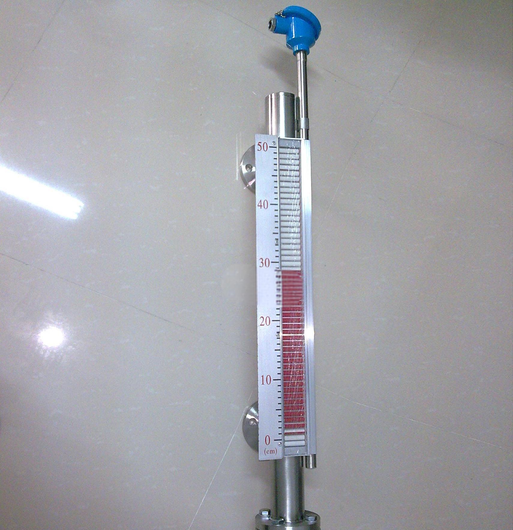 远传磁翻板液位计是基本型与远传变送器两部分的组合即可实现信号远传、液位报警及控制功能。液位远传装置由UR型电阻传感器和UB型R/I转换模块组成,该变送器的传感器以捆绑的形式固定在UHZ型磁翻板液位计的主导管外侧,使其处于液位计同一磁耦合系统中。当磁性浮子随液位上下移动时,对应液位位置的干簧管受浮子内磁场的作用吸合,电阻链阻值发生变化,通过转换模块将变化的电阻信号转换成二线制4~20mADC标准信号输出,该信号可方便地与电动III型仪表、显示仪配套使用,亦可与光柱指示、数字显示调节报警仪配套使用,从而达到显示、控制、调节和报警的目的。远传磁翻板液位计具有直观、醒目、性价比高、耐温、耐压、防腐、防爆的特点,广泛应用于电力、石油、化工、冶金、环保等行业过程中的液位测量及自动化控制。远传磁翻板液位计几乎可以适用于各种工业自动化过程控制中的液位测量与控制。