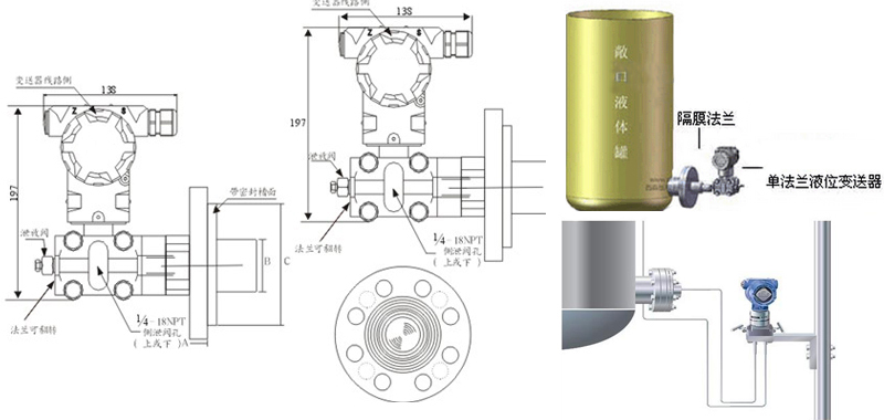 单法兰液位变送器可以直接安装在敞口的管道或容器上,由于隔离膜片直接与液体介质相接触,无须将正压侧用导压管引出,因此可以测量高温、高粘度、易结晶、易沉淀和强腐蚀等介质的液位、压力和密度,然后将其转换成4~20mA.DC信号输出。