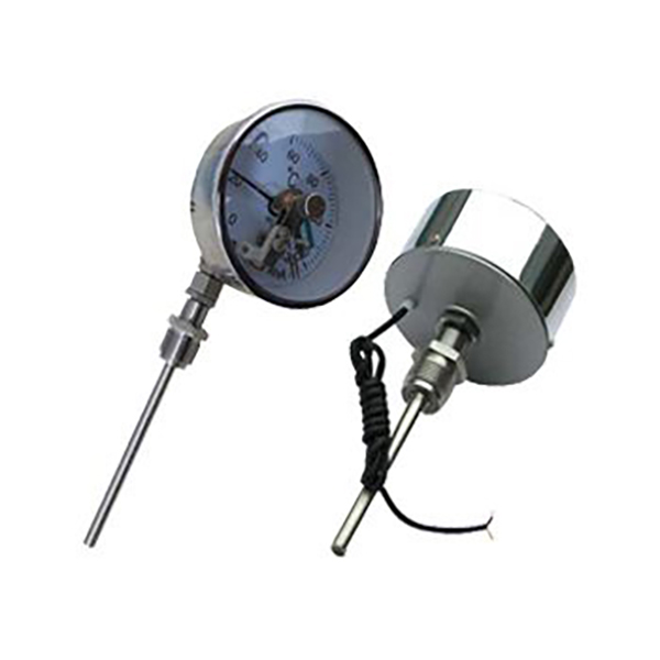 电接点双金属温度计是基于绕制成环性弯曲状的双金属片组成。一端受热膨胀时,带动指针旋转,工作仪表便显示出热点势所应的温度值。